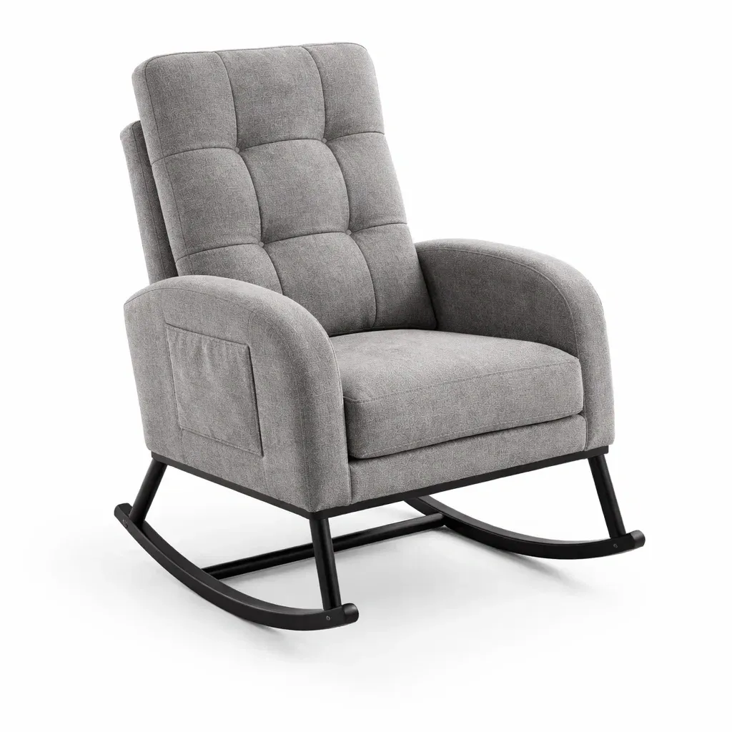 Ce fauteuil à bascule présente un revêtement en tissu polyester doux et résistant, avec un rembourrage en mousse pour le confort.